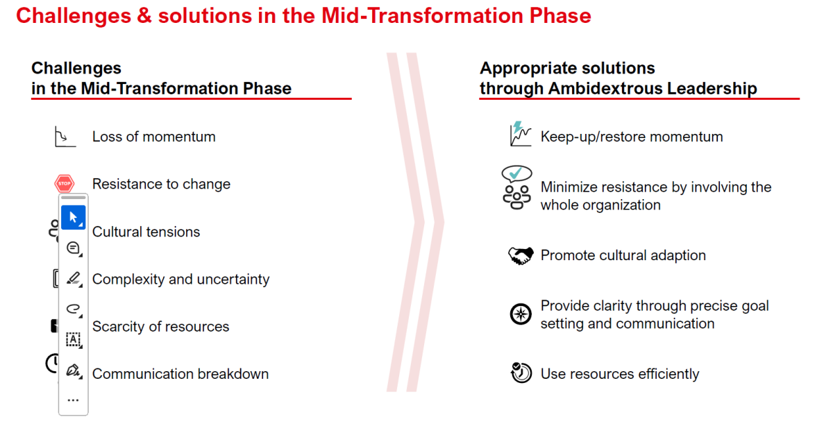 Ambidextrous Leadership, the ability to support both exploratory and exploitative activities simultaneously, offers a promising approach to overcoming some of the mid-transformation challenges. This leadership style requires balancing the promotion of innovation with the maintenance of operational excellence.